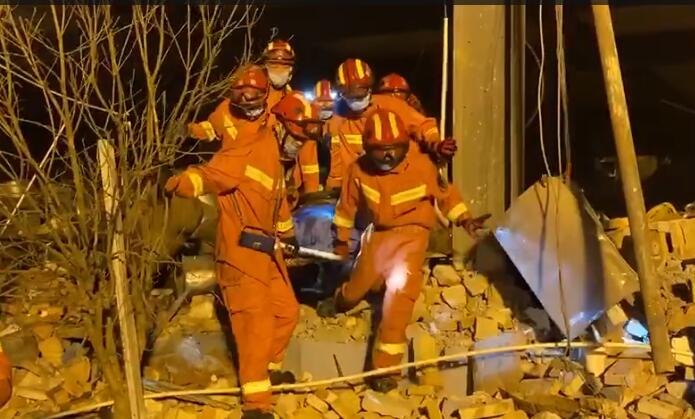 浙江温岭油罐车爆炸救援现场 消防员从坍塌的厂房抬出被困人员