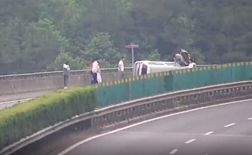 面包车高速上爆胎侧翻车内7人均无恙:大家都系了安全带