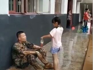 暖心一幕!小女孩给帮清理学校淤泥战士送水并敬礼