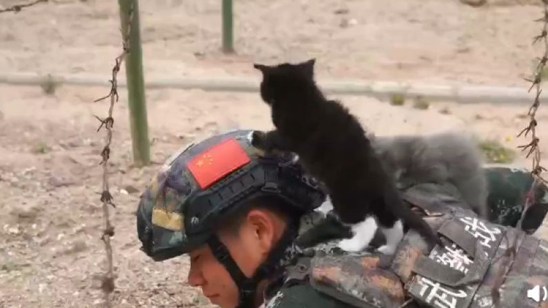 超有爱!小猫钻背包陪兵哥哥一起训练