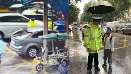 交警雨中执勤,路过小学生踮起脚尖为其撑伞,监控拍下温馨一幕