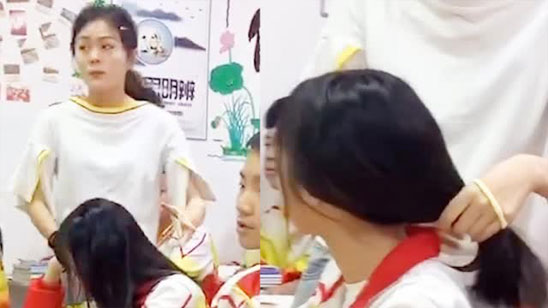 女老师悄悄走向披散头发的打盹女生 用自己的头绳为其扎头发