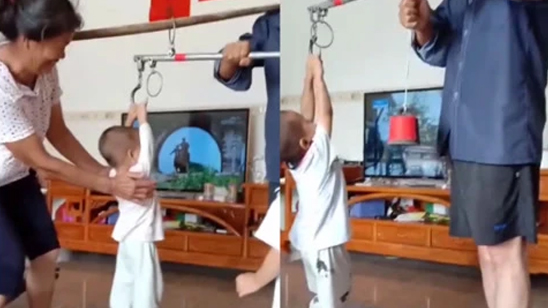 爷爷用杆秤给孙子称体重 网友:100斤就可以“出栏”了