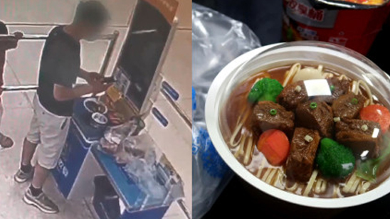 尴尬了!男子超市偷熟食佯装结账被拦 慌乱中偷了一碗牛肉面模型