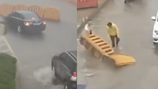 暖心一幕!顶着齐膝积水 俩外卖小哥接力清理路面