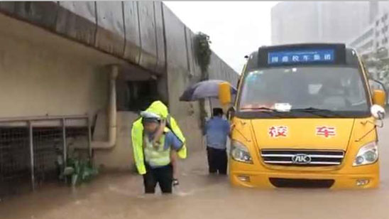 东莞暴雨积水困住校车 民警蹚水背出孩子