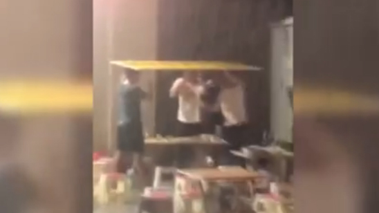 4男子顶纸板暴雨中吃饭喝酒2小时:只想用纸板挡雨