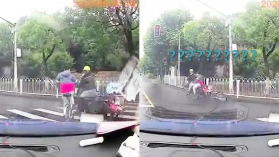 自行车与三轮车相撞 车主瞬间被“带走” 网友:一定是特别的缘分