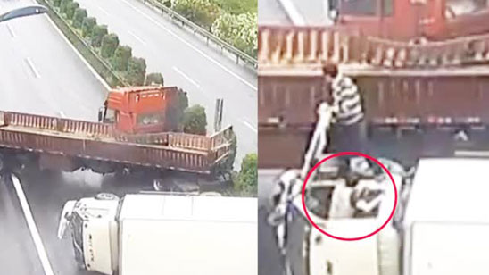 货车高速上突然侧翻 后车尽力躲闪仍被殃及 司机的举动令人泪目
