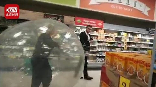 为避免接触新冠病毒 英国一女子全身躲在充气球里逛超市