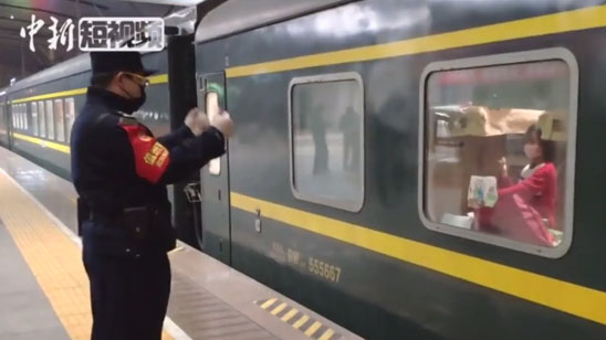 感动!女孩车厢内隔窗展示绘画 为铁路民警加油