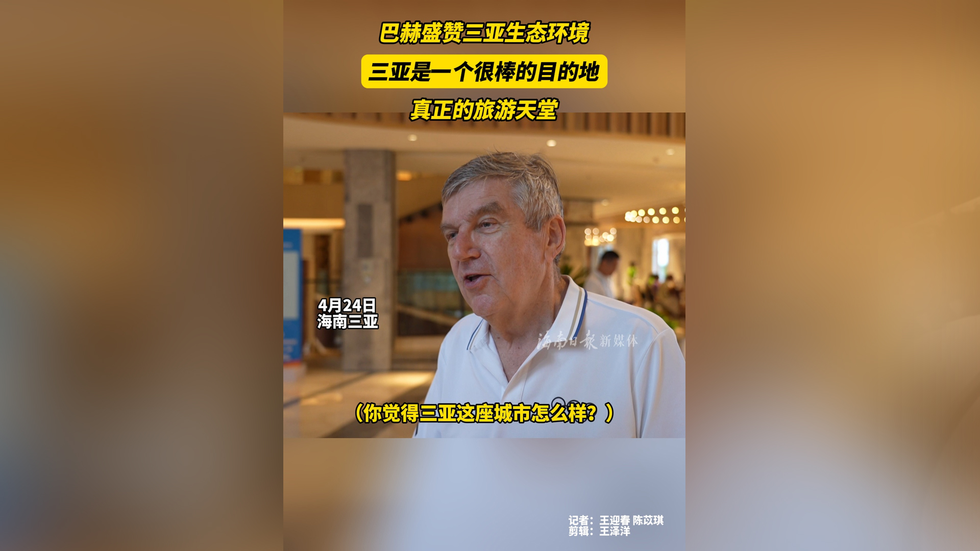 巴赫盛赞三亚生态环境:三亚是一个很棒的目的地,真正的旅游天堂
