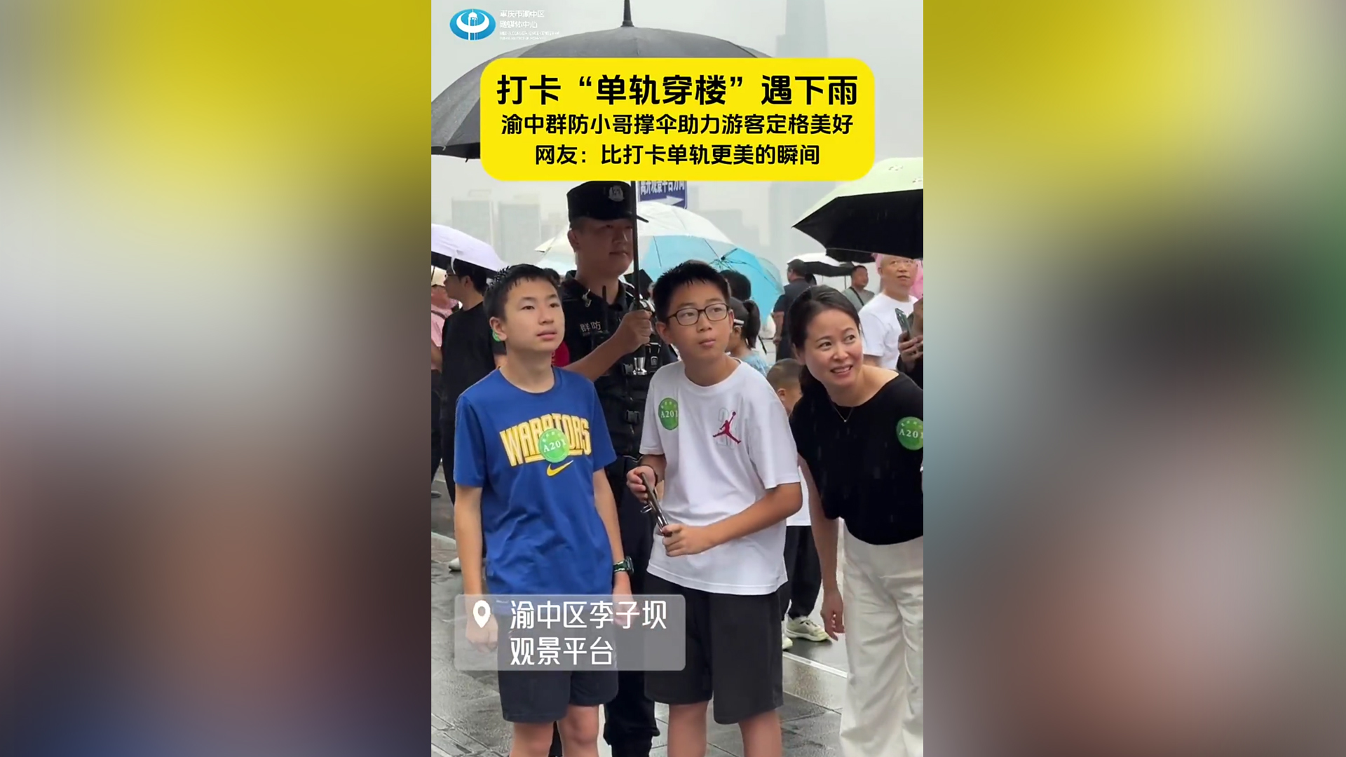 游客在雨中打卡“单轨穿楼” 重庆群防小哥在其身后默默撑伞