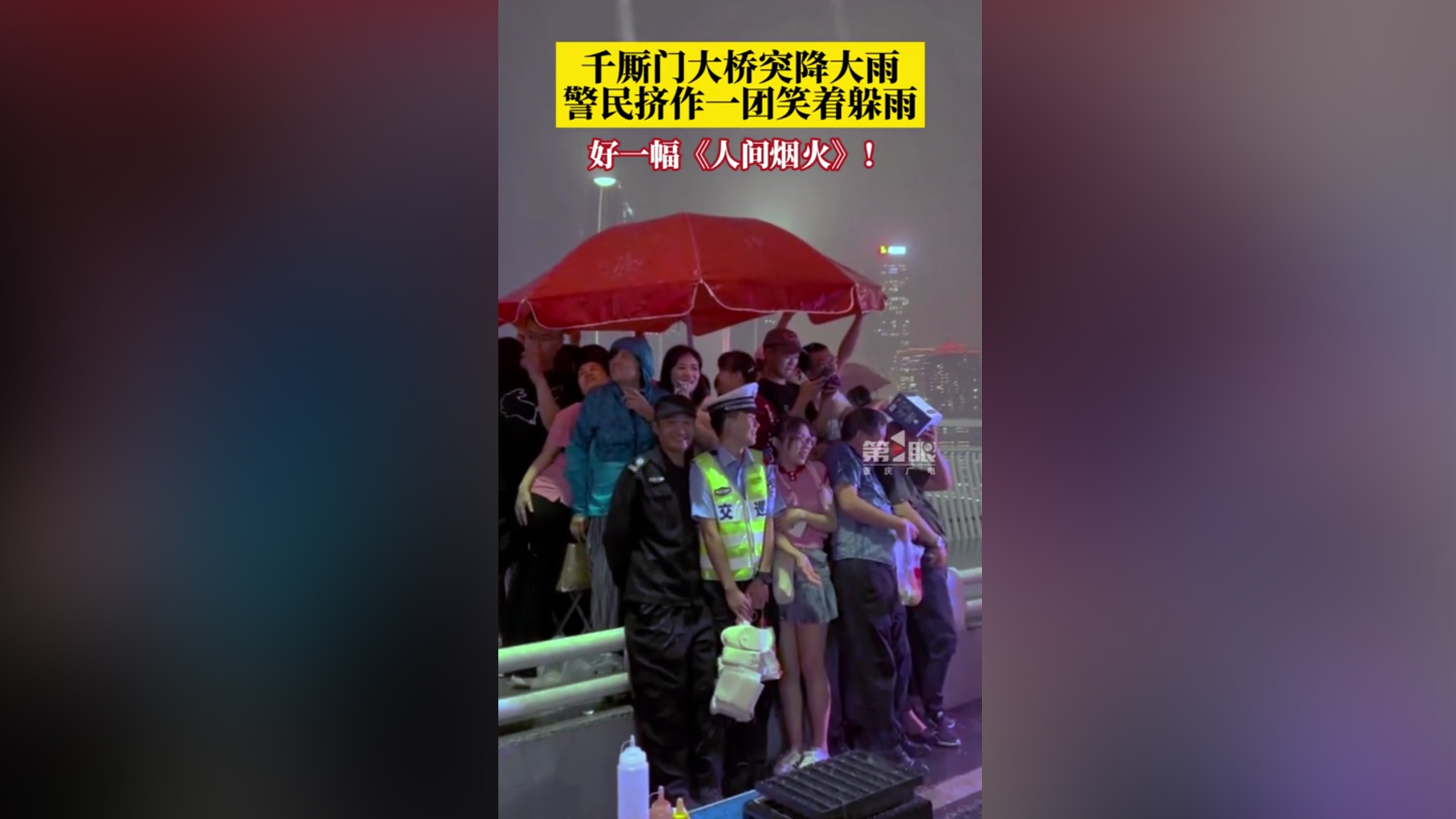 重庆千厮门大桥突降大雨 警民挤作一团笑着躲雨