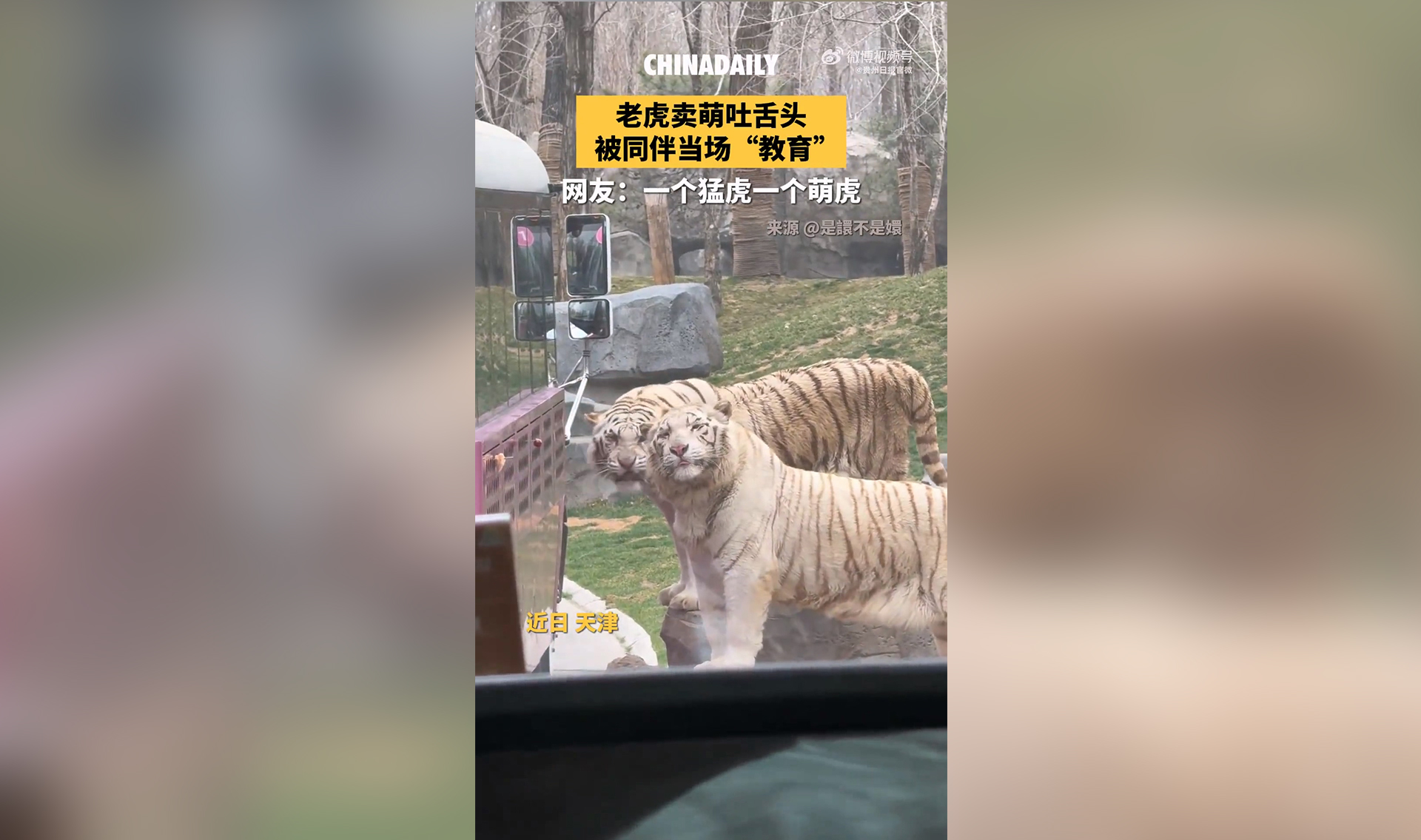 老虎届也有没头脑和不高兴!老虎卖萌吐舌头被同伴呲牙“教育”