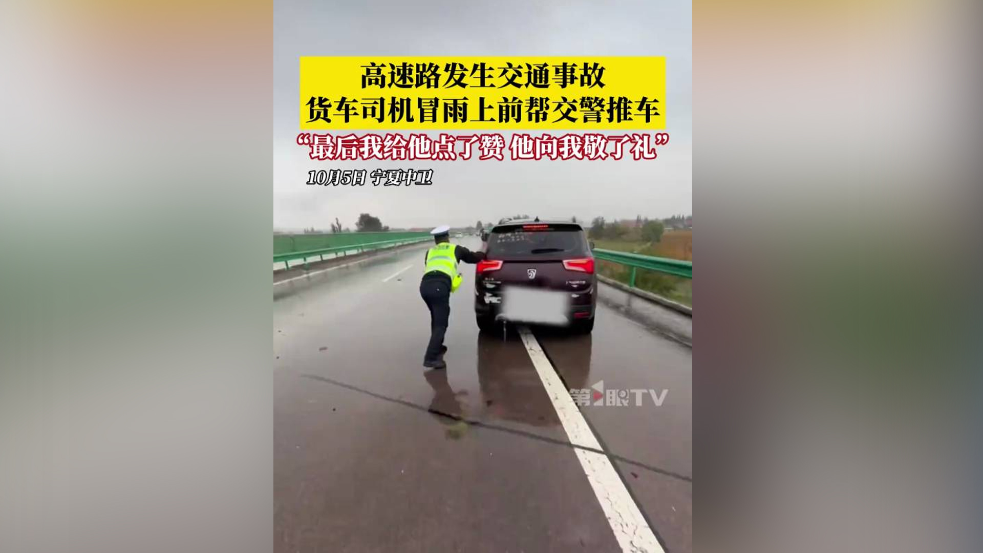 高速路上发生交通事故 货车司机冒雨上前帮助交警推车