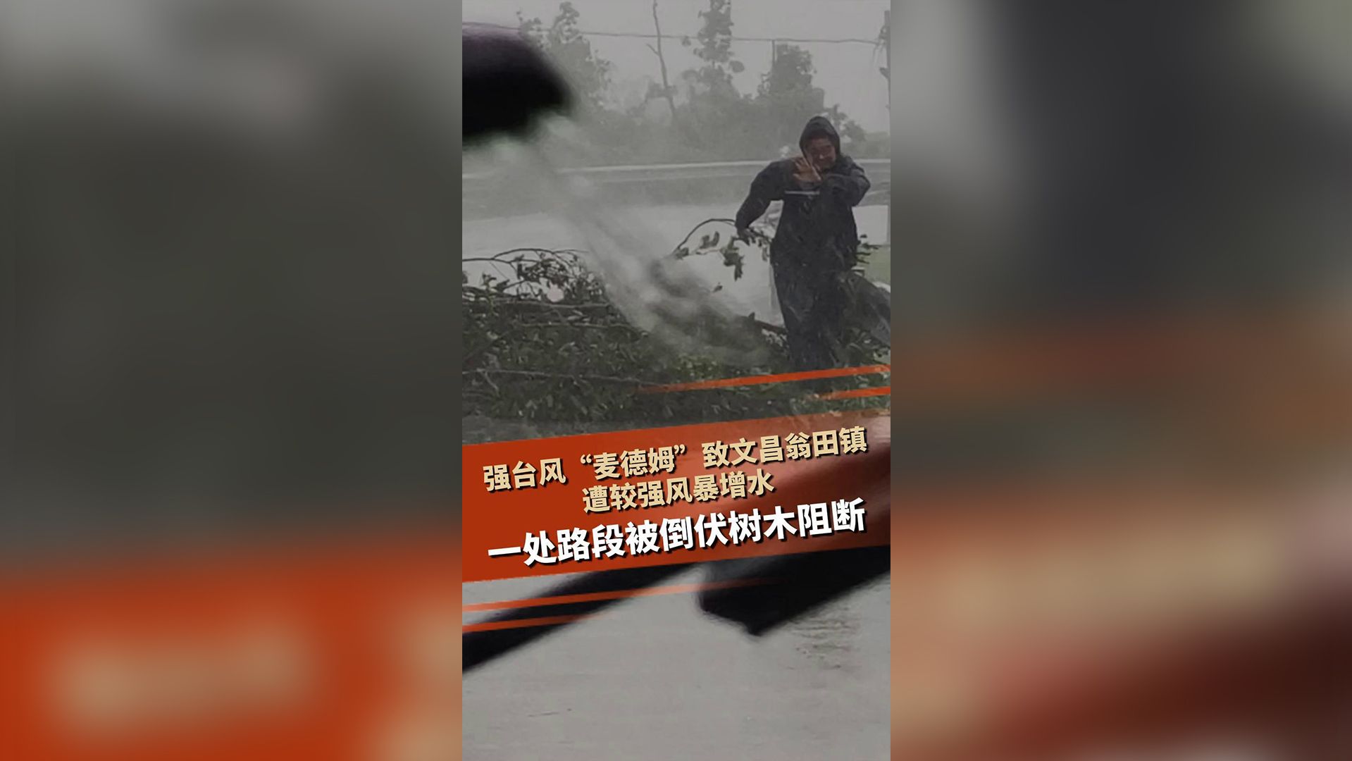 强台风“麦德姆”致文昌翁田镇遭较强风暴增水,一处路段被倒伏树木阻断