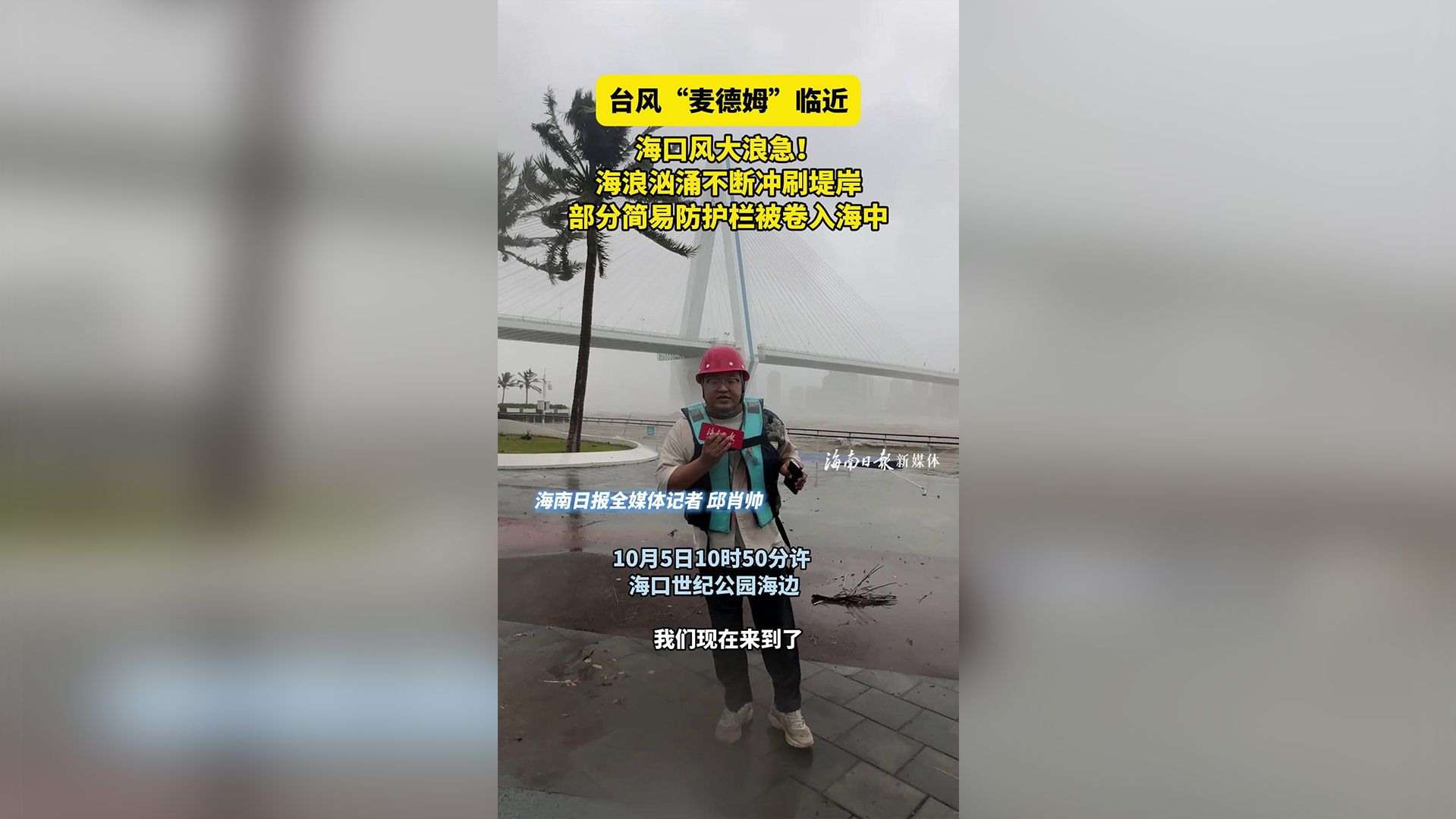 台风“麦德姆”临近,海口风大浪急,海浪汹涌不断冲刷堤岸,部分简易防护栏被卷入海中