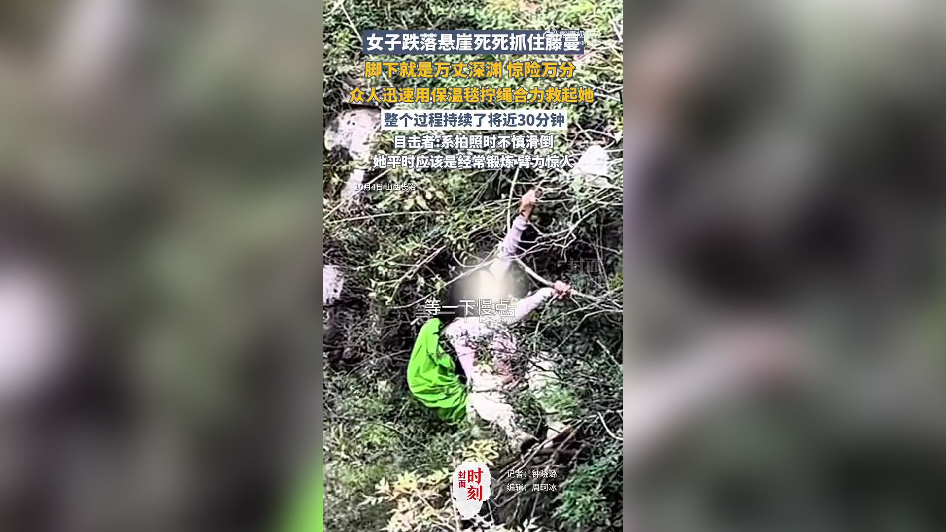 女子脚滑跌落悬崖抓紧藤蔓呼救 众人用保温毯拧绳救起