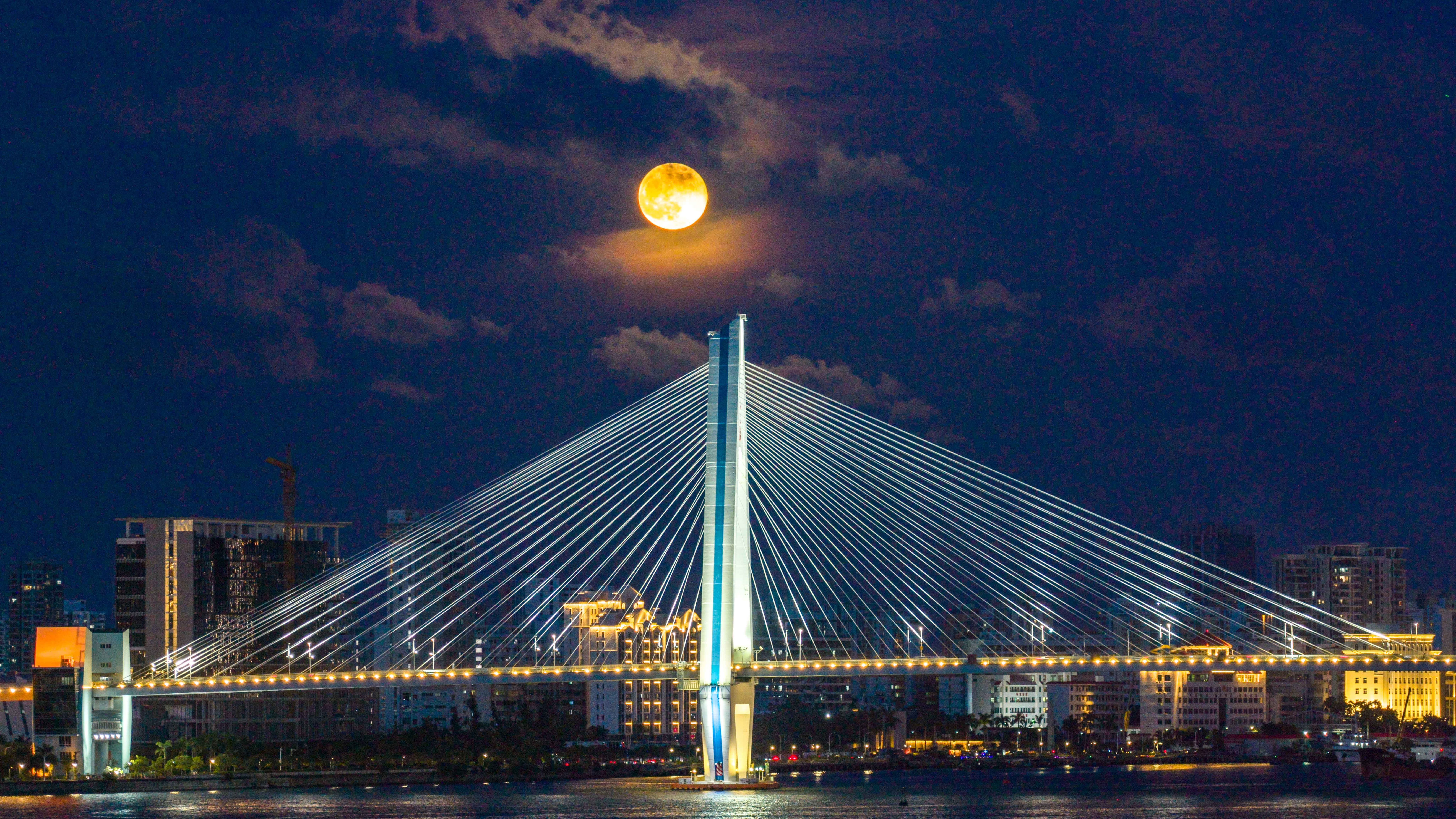 10月8日清晨六点,国庆中秋假期的最后一缕夜色尚未褪尽,海口新海港已灯火通明,与天边的景致构成一幅动人画卷——红色朝霞漫染天际,一轮皓月仍悬半空,金辉泼洒海面,如揉碎的金箔随波轻漾。
