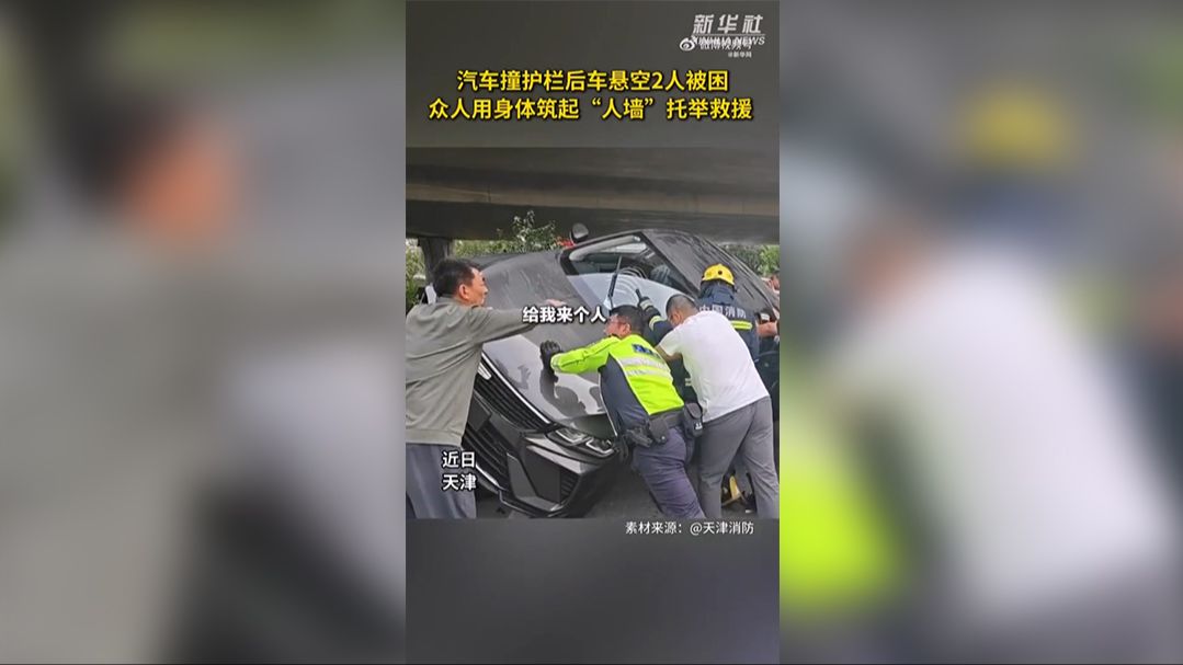 汽车撞护栏后车悬空2人被困 众人用身体筑起“人墙”托举救援