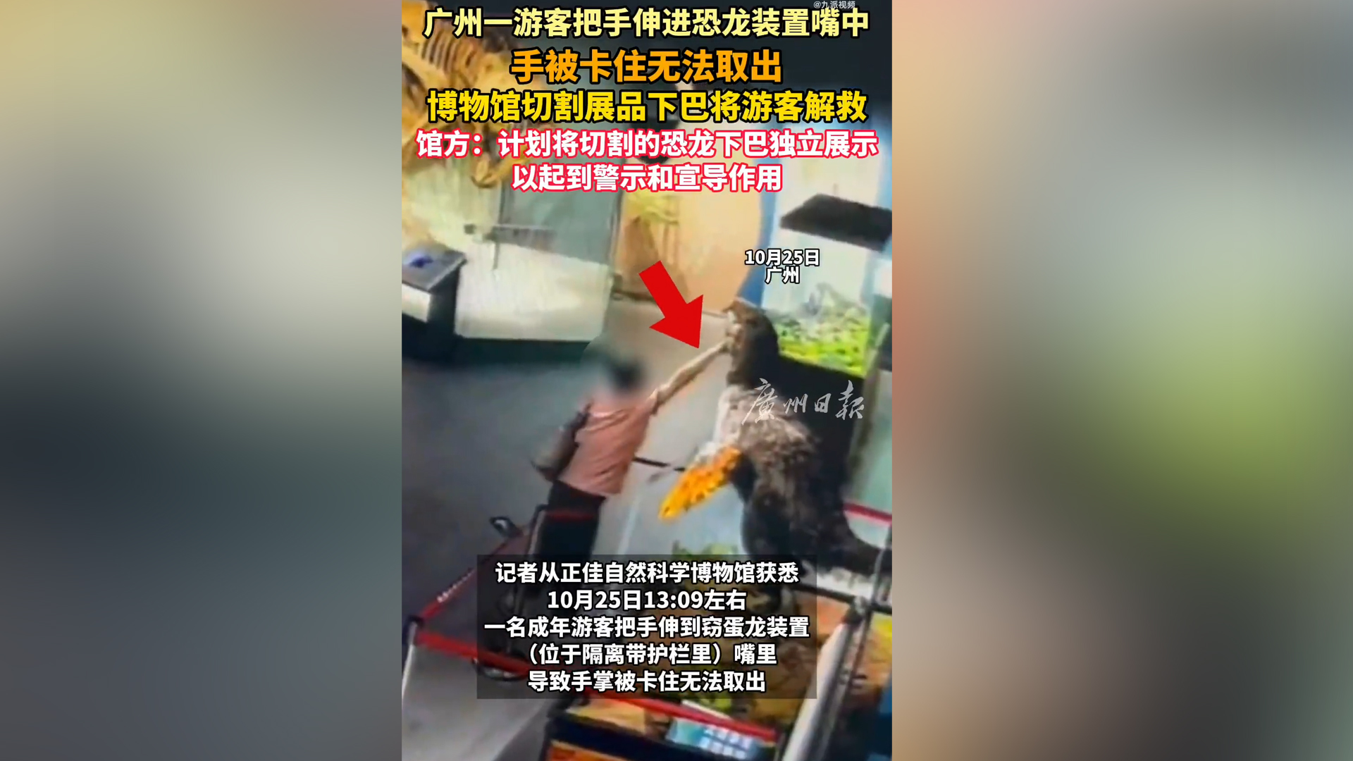 游客伸手进博物馆恐龙嘴中被卡 馆方切除模型下巴将其解救