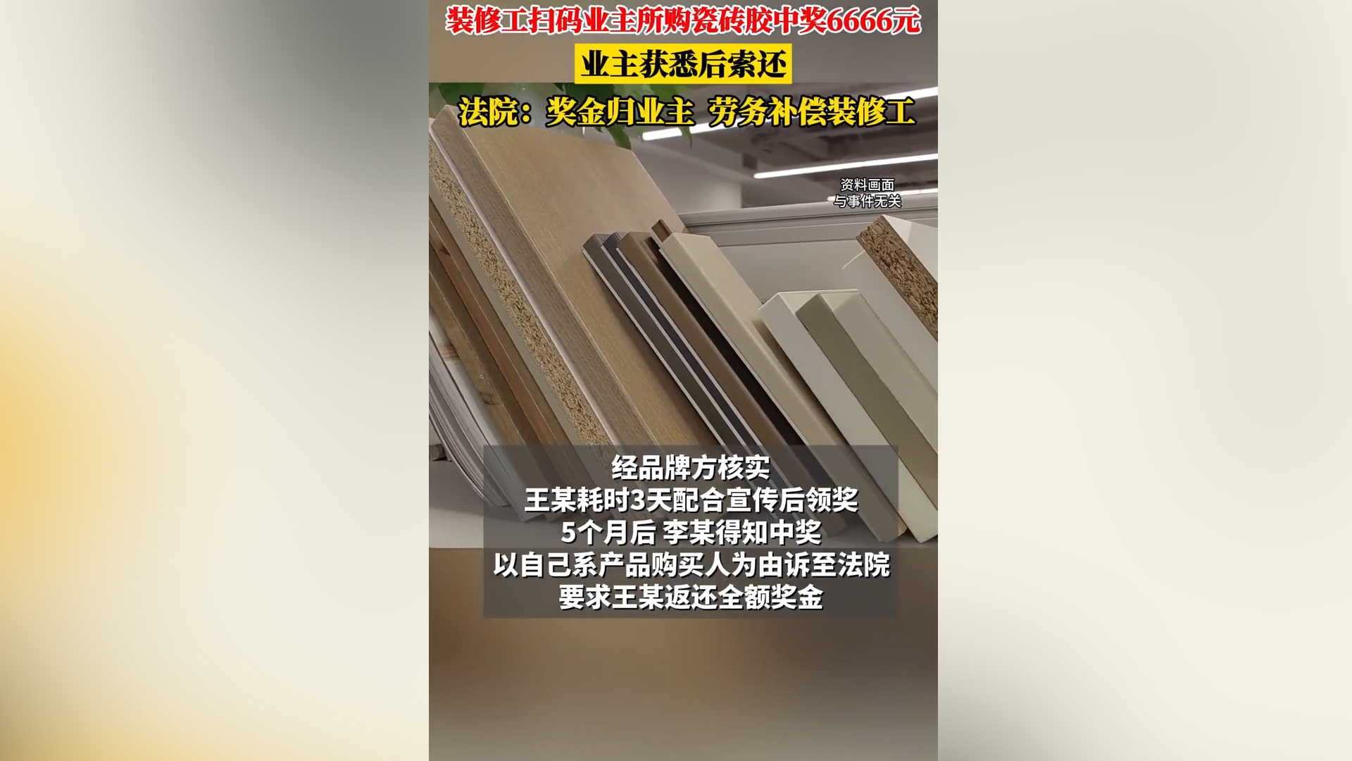 装修工扫码业主所购瓷砖胶中奖6666元 业主获悉后索还全额奖金