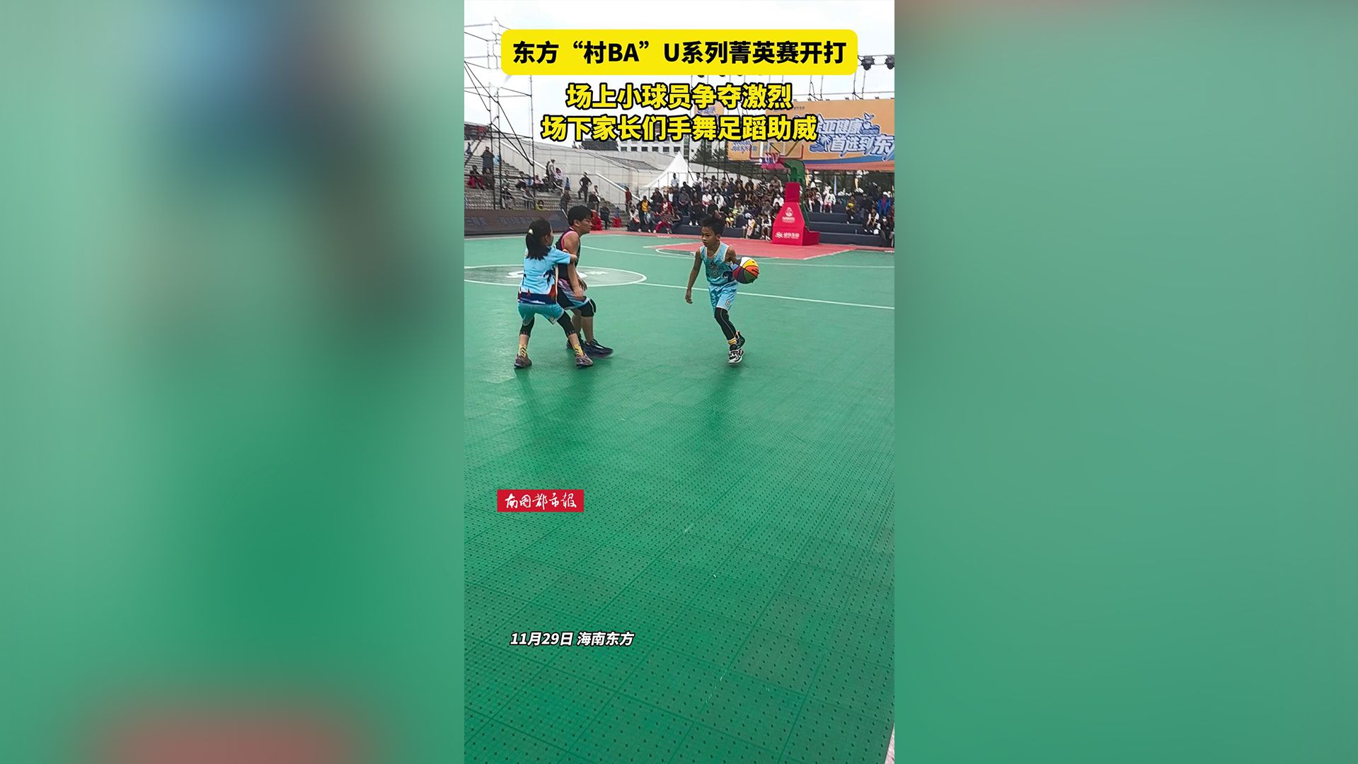 海南东方“村BA”场上小球员争夺激烈,场下家长们手舞足蹈助威