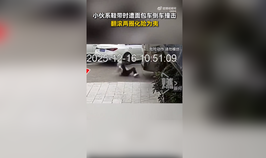 小伙系鞋带时遭面包车倒车撞击 翻滚两圈化险为夷