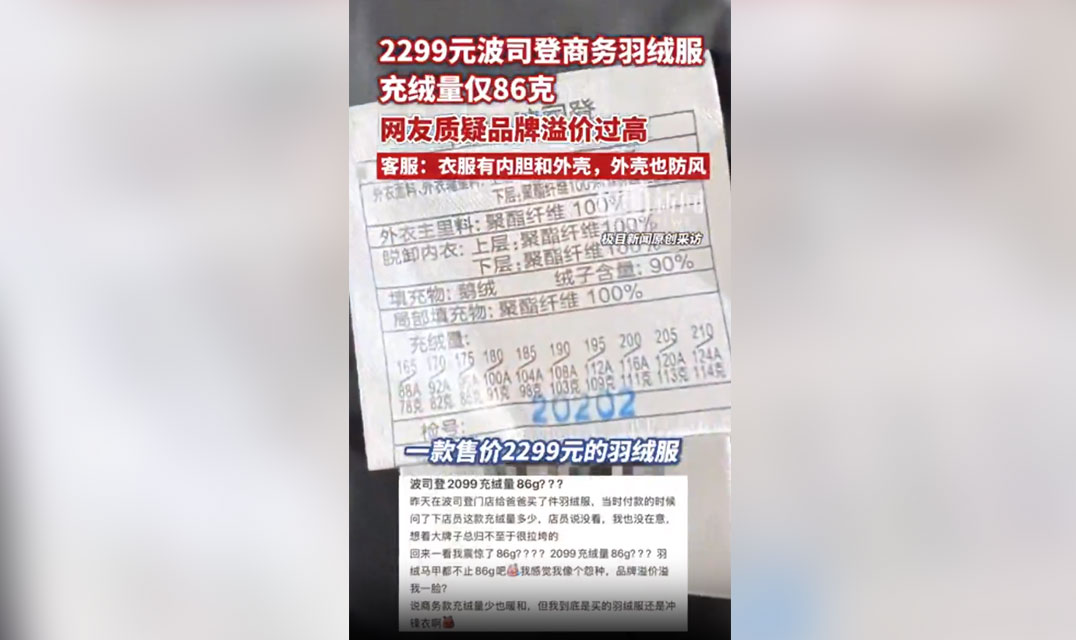 2299元波司登商务羽绒服充绒量仅86克