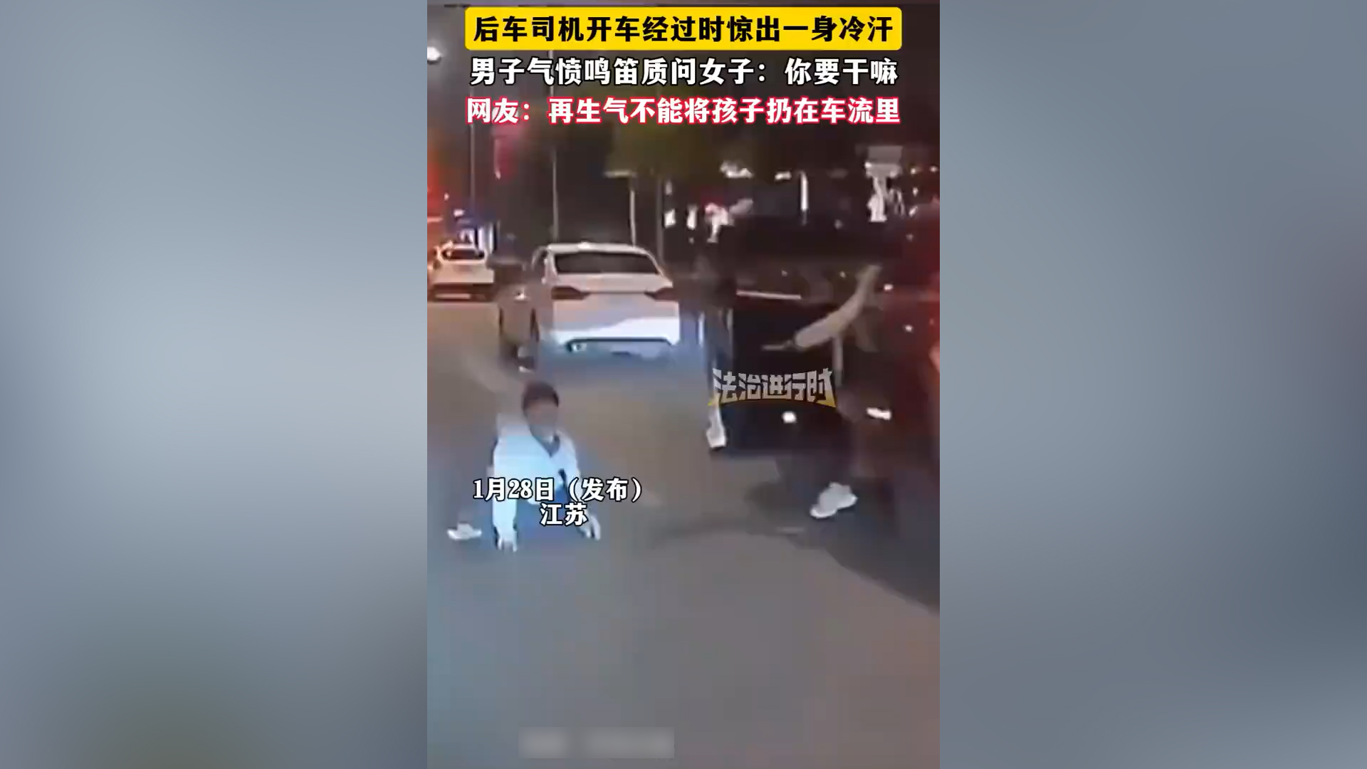 男孩被女子猛推摔倒在马路中间 后车司机经过惊出冷汗