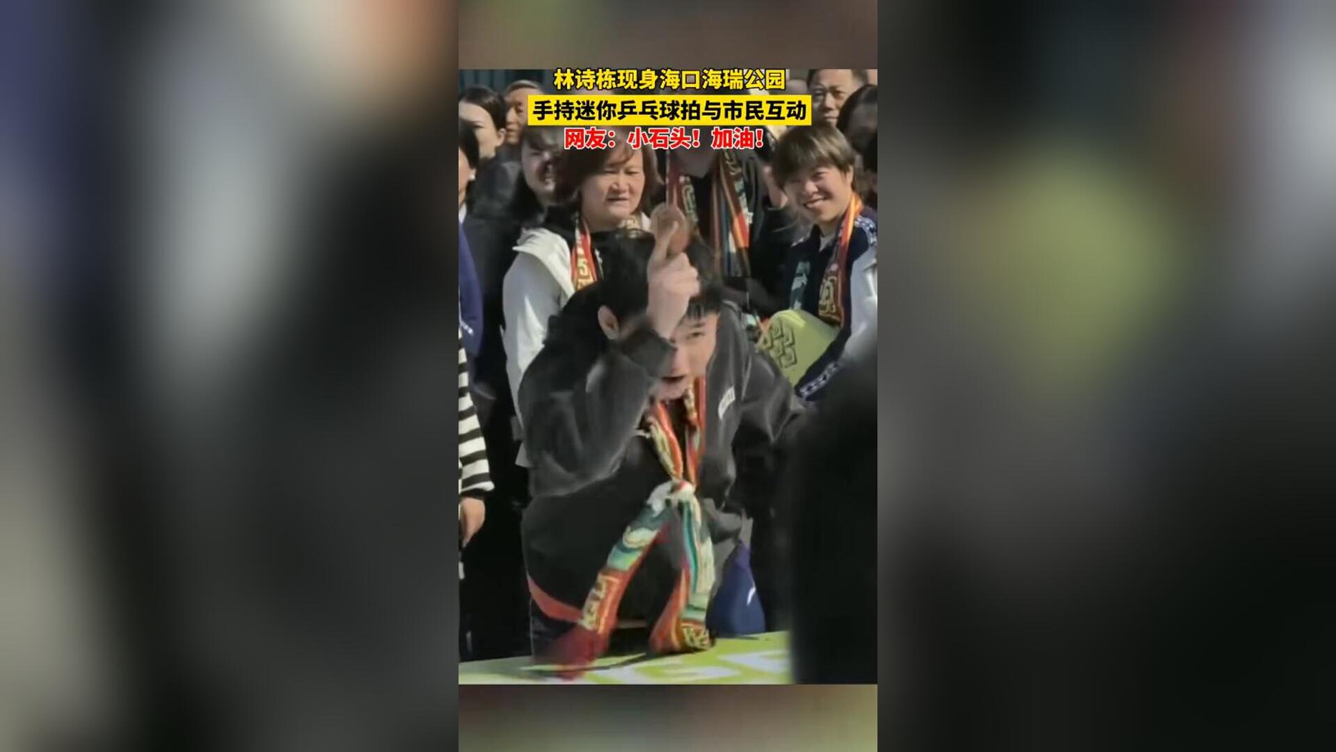 林诗栋现身海口海瑞公园 手持迷你乒乓球拍和市民互动