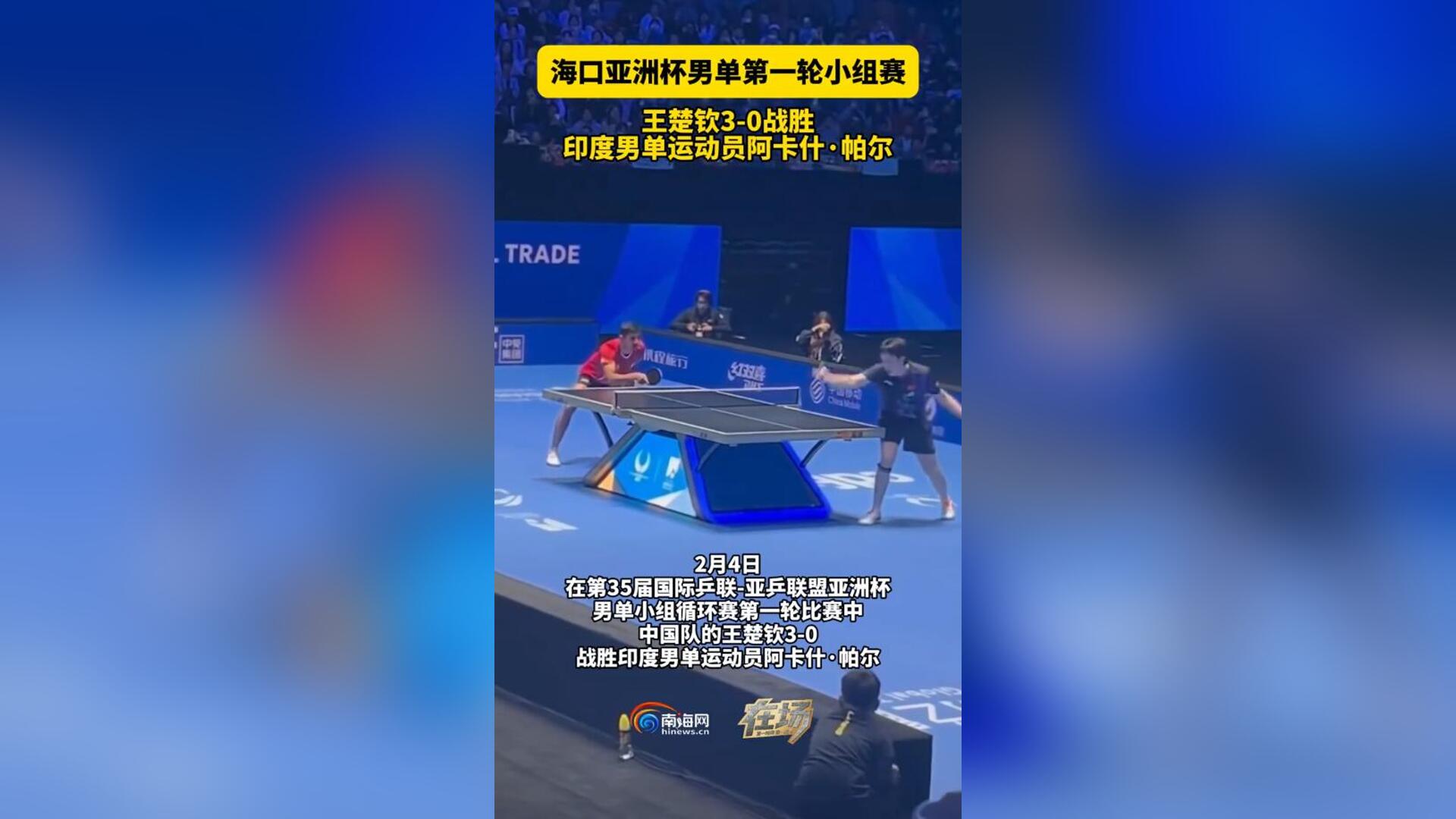 海口亚洲杯男单第一轮小组赛 王楚钦3-0战胜印度男单运动员阿卡什·帕尔