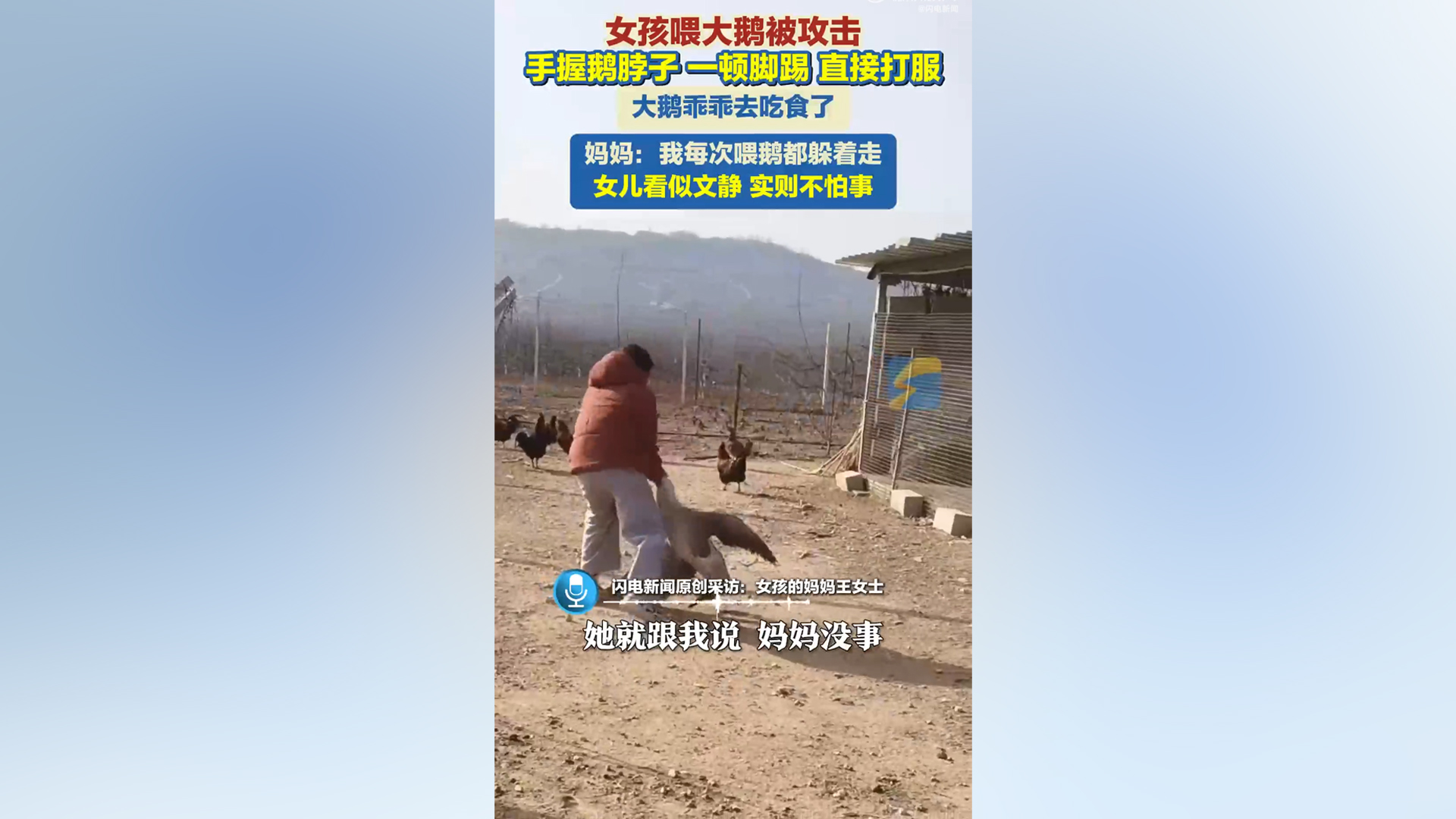 女孩喂大鹅被攻击 反手握住鹅脖子将其直接打服