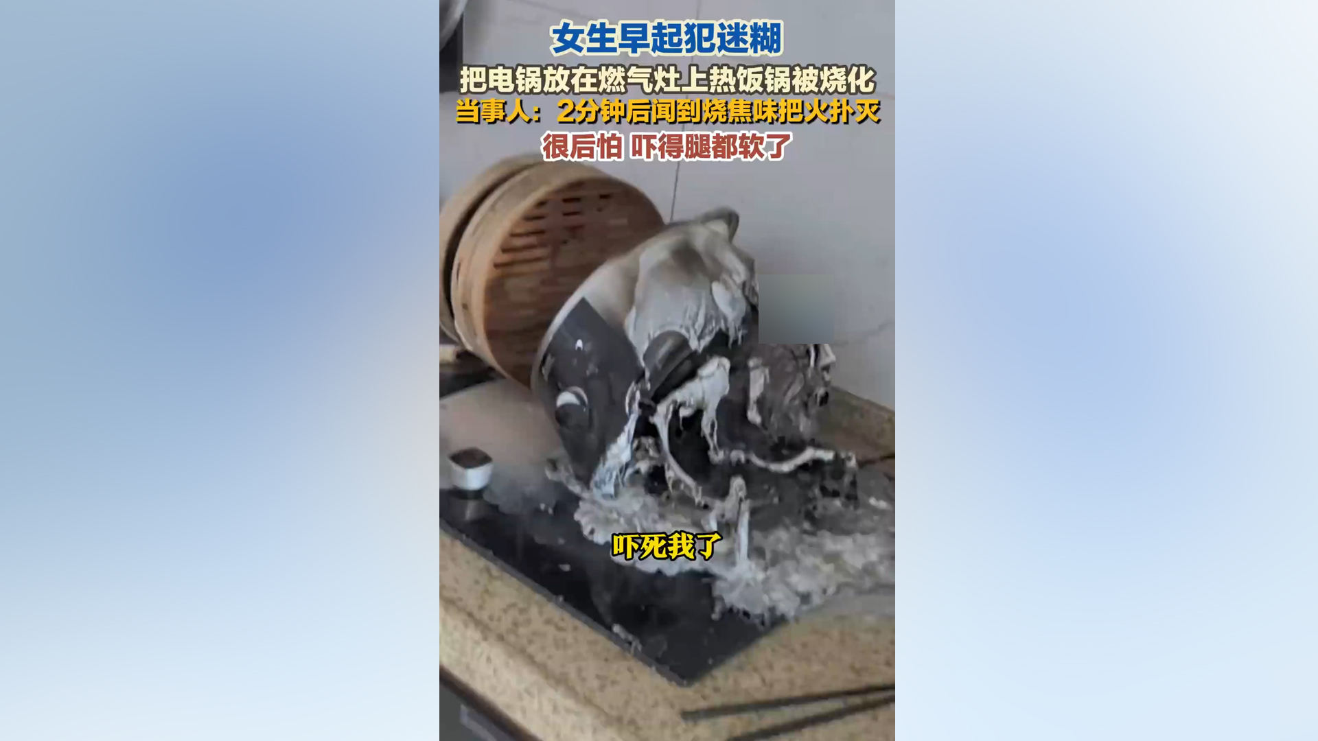 女生早起犯迷糊 电锅放燃气灶上热饭被烧化