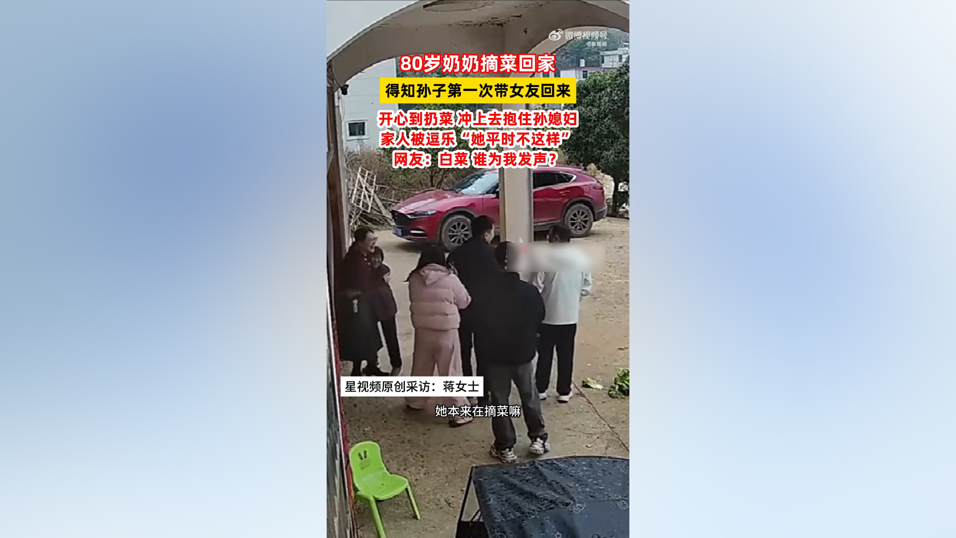 孙子带女友回家 80岁奶奶开心到扔菜上前与其拥抱
