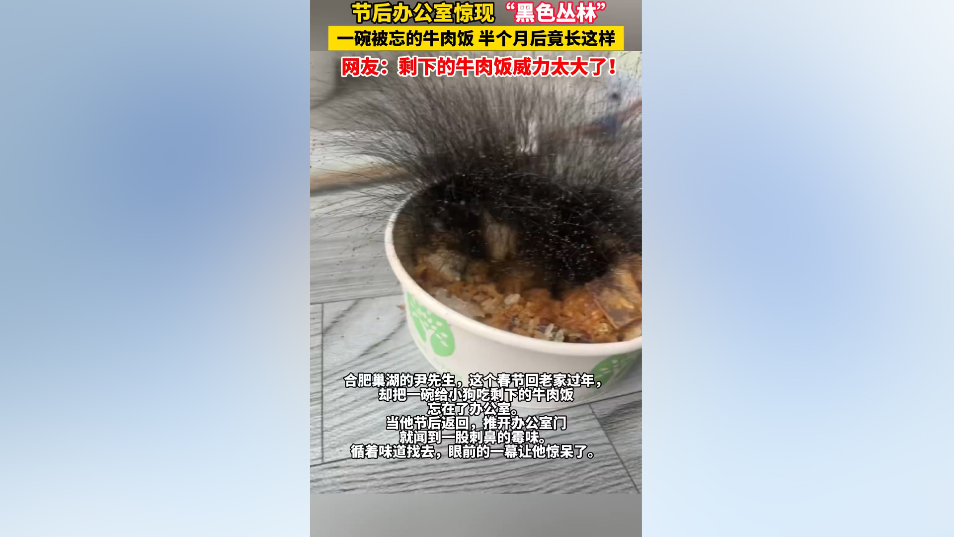 男子节后返工办公室遇惊魂 遗忘的牛肉饭长出15cm“黑发”